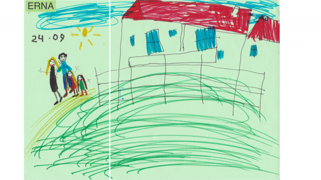 - Demgegenüber erscheint das Haus um einiges grober, unruhiger, ja gereizt und machtvoll, zur Darstellung gebracht. Das dürfte darauf beruhen, dass die horizontale Achse seiner Fenster zur Vier-Personen-Gruppe hin ausgerichtet, also nicht mit der Dachkante parallel gehalten ist. Das wirkt dann so, als ob das (hohe) Haus streng und von oben herab auf diese Gruppe blickt. Dies, obwohl die Gruppe betont freundlich dreinschaut; allerdings aus dem Bild ‚heraus‘ zu Betrachter*innen schaut, also nicht die vermeintlichen Blicke des Hauses (und seiner Fenster) erwidert. Der strenge und abweisende Charakter des Hauses wird durch scharfkantige Konturen des Gebäudes, das sich leicht nach rechts (weg von der Gruppe) neigt, unterstrichen.