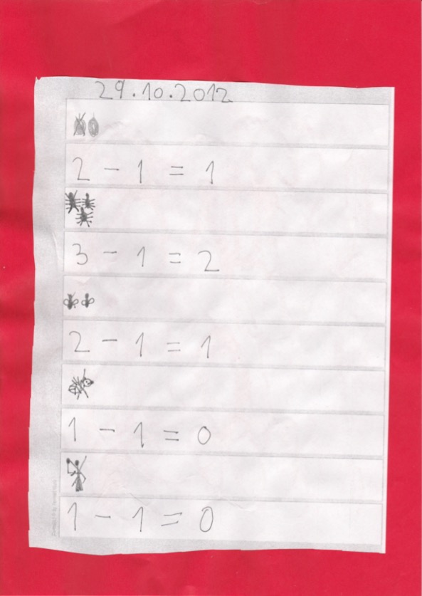 – Das große Problem – von der Erna – war die Mathematik, und das Blatt hat sie auch selbst hineingegeben, das heißt das ist am 29. Oktober in der ersten Klasse passiert, (siehe Blatt 29.10.2012(Übung 2-1=), Clip3, Audio-Transkript, Abs. 12)