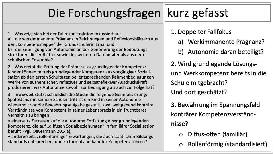 Die Forschungsfrage 3 fokussiert zwar auf die Überprüfung eines (späteren) Zwischenergebnisses der Studie, wonach sich Schüler*innen in ihren ersten Schuljahren zwischen konfligierenden Kompetenzverständnissen (familiär-diffus und schulisch-formal) bewähren müssten (siehe Kapitel 1.3). Also setzt diese Frage einen bereits fortgeschrittenen und kumulierten Forschungsprozess voraus. Aber erste Ergebnisse zeichnen sich doch bereits ab – oder deuten sich zumindest an: